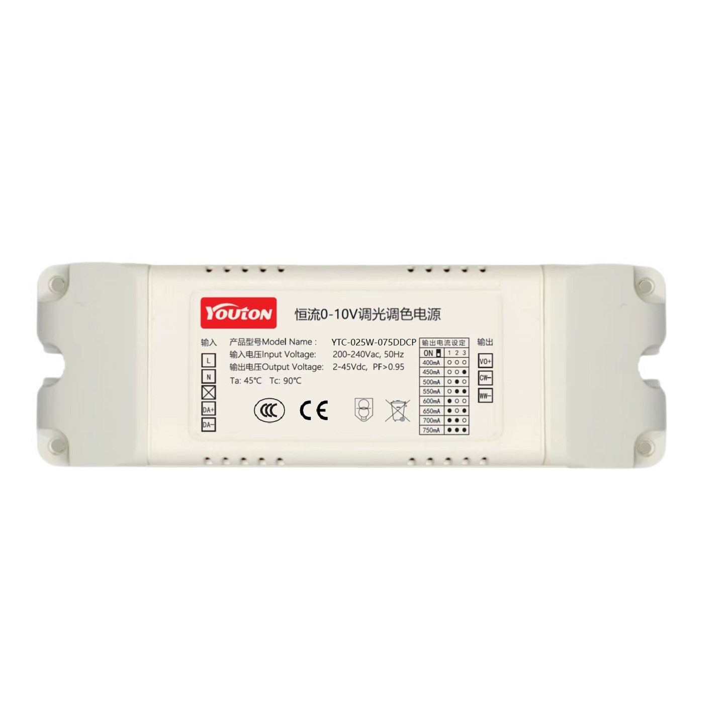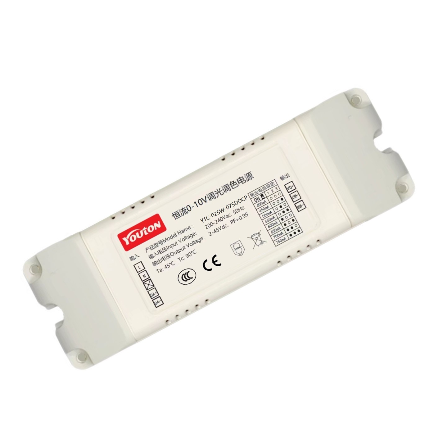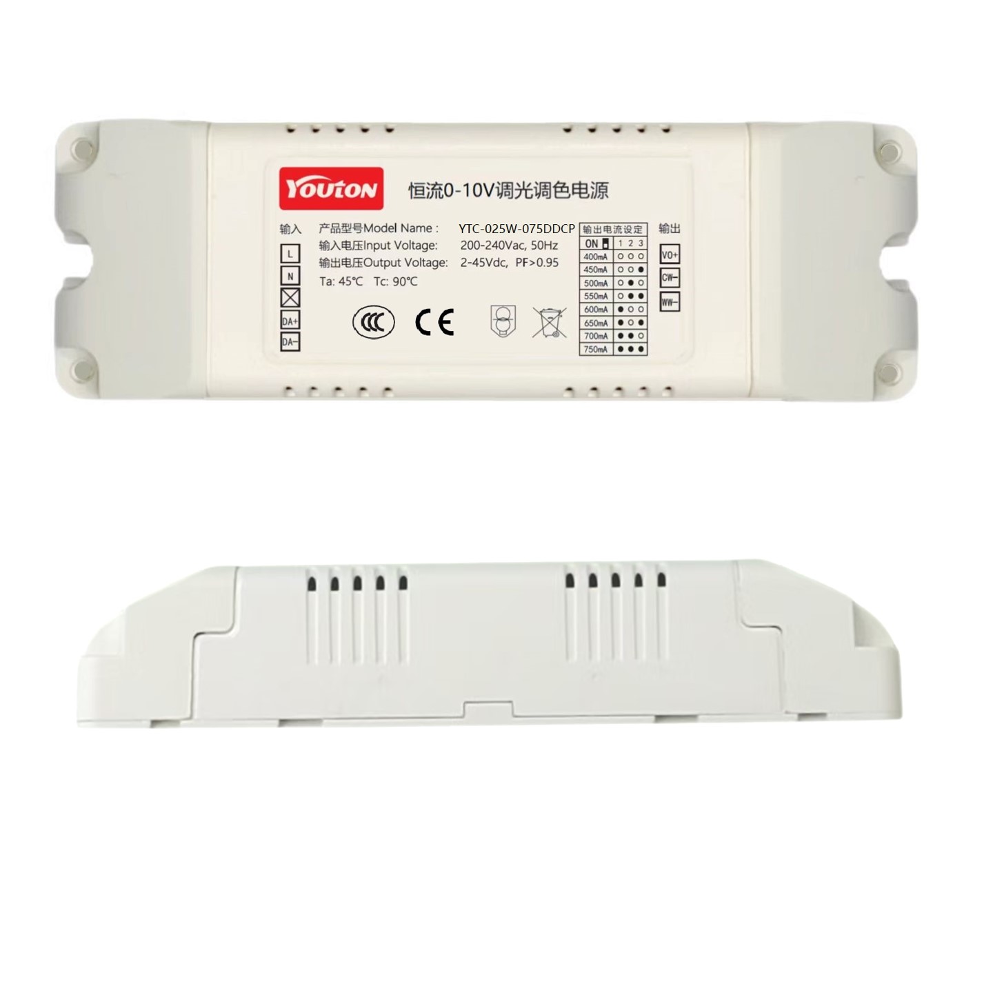 0-10V一体式恒流调光电源,具有驱动和调光/调色的功能, 用于恒流灯具实现亮度和色温的变化控制。