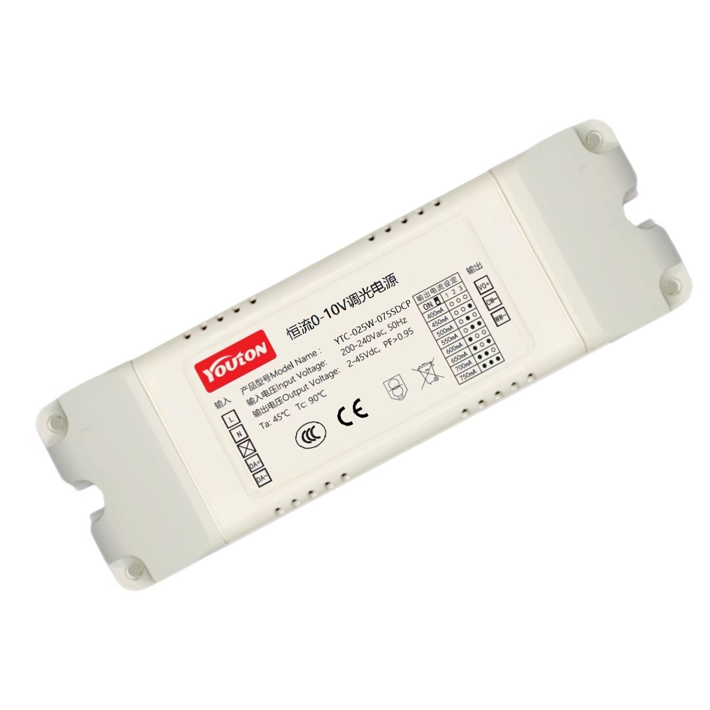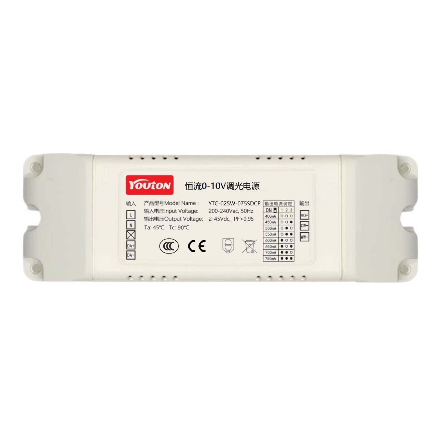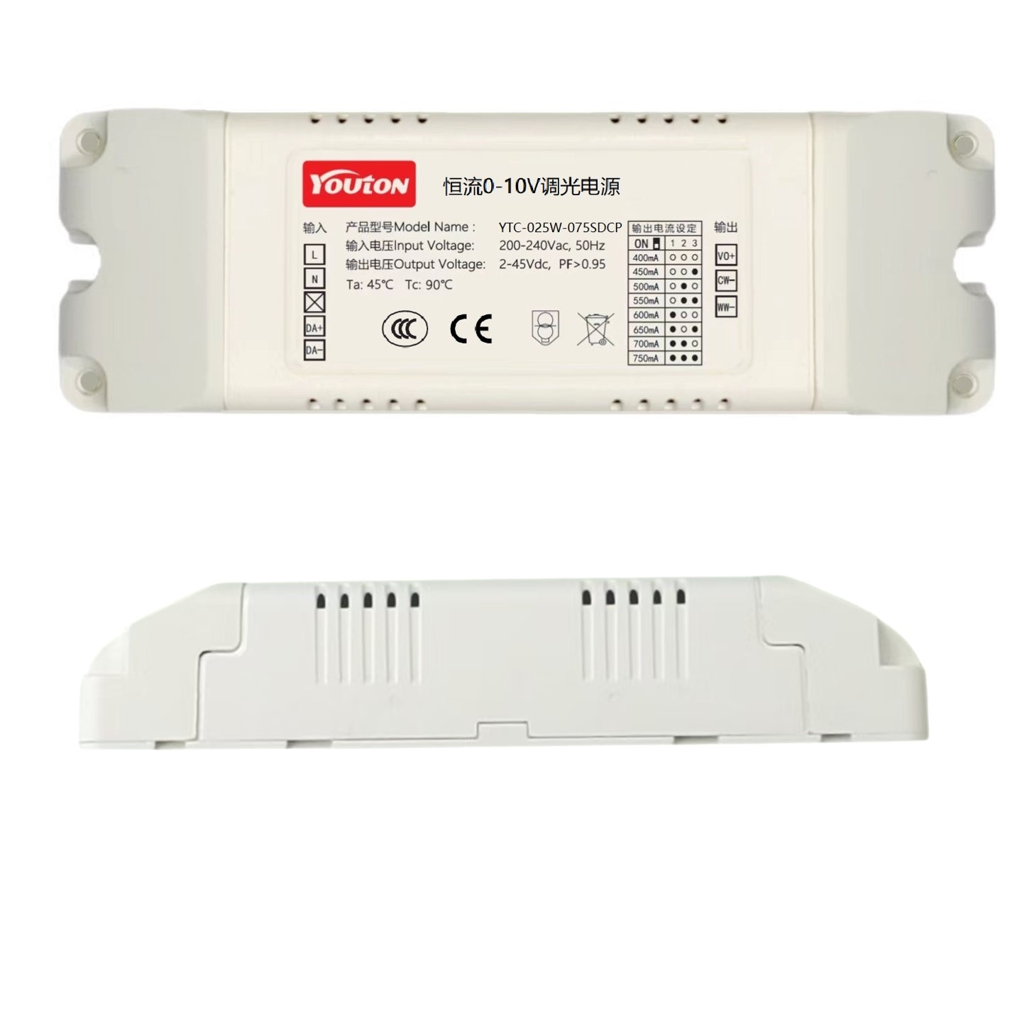 0-10V一体式恒流调光电源,具有驱动和调光/调色的功能, 用于恒流灯具实现亮度和色温的变化控制。