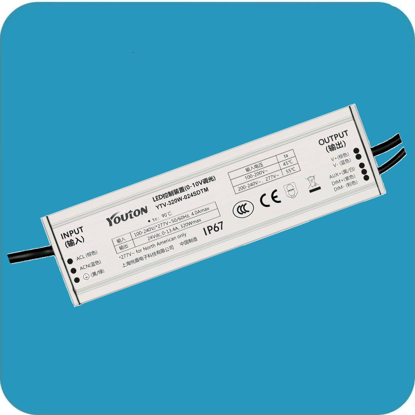 0-10V—体式恒压调光驱动, 兼有驱动和调光器的功能, 用于恒压灯具实现亮度的变化控制。
